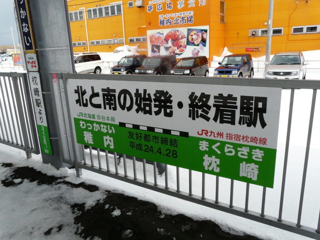 稚内駅の構内には最北の駅らしく、枕崎駅と同様に南との対比の看板が多く設置しています。