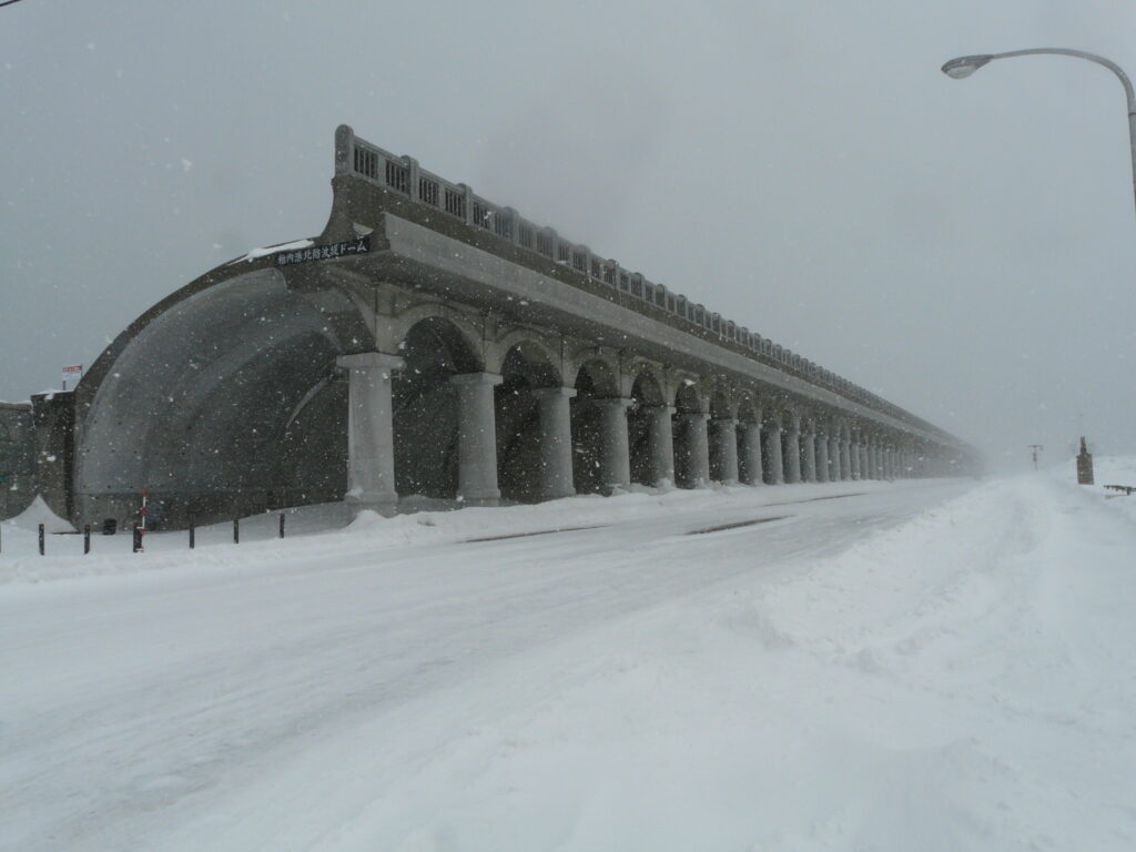 稚内駅から少し北側に歩いたところにあるこの特徴体な建物は北防波堤ドームです。この建物は桟橋の保護などの目的で造られ、この建造物付近まで鉄道が来ていました。
