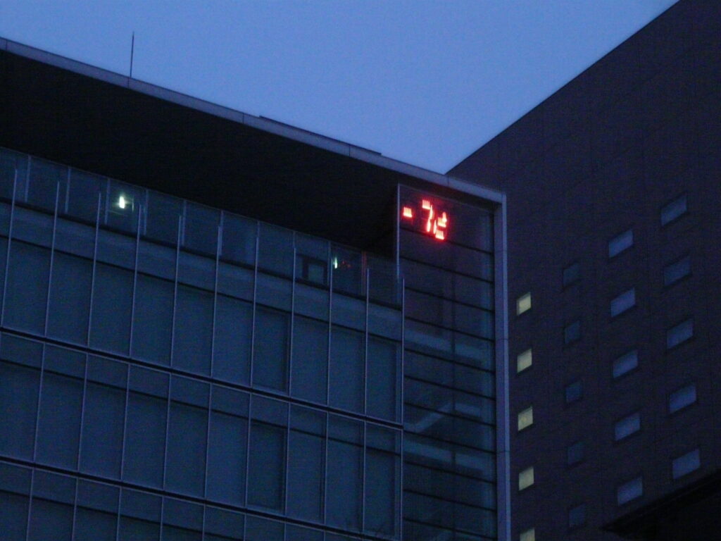 本日は札幌駅付近からスタート。ビルの一角が示す温度はー7℃、関東ではありえない程度には寒いです。