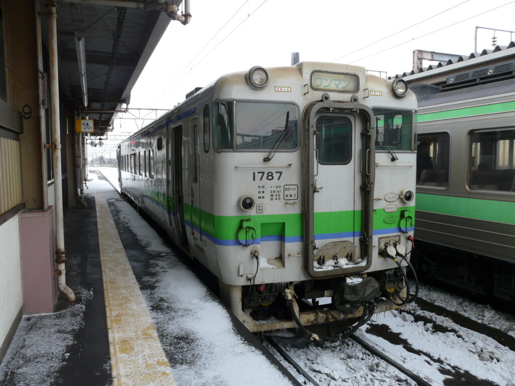 この駅が始発となる列車は夕張行きの普通列車です。千歳駅自体は千歳線の電車が走る駅ですが、ここから乗り込む列車は一両編成の気動車です。