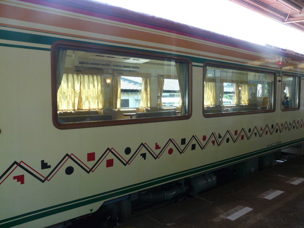 この列車は新下関~仙崎を結んだ観光列車です。2両目が指定席になっており、海側に座席が向いていたり、テーブルが設置されていたりなど洒落たつくりとなっています。
