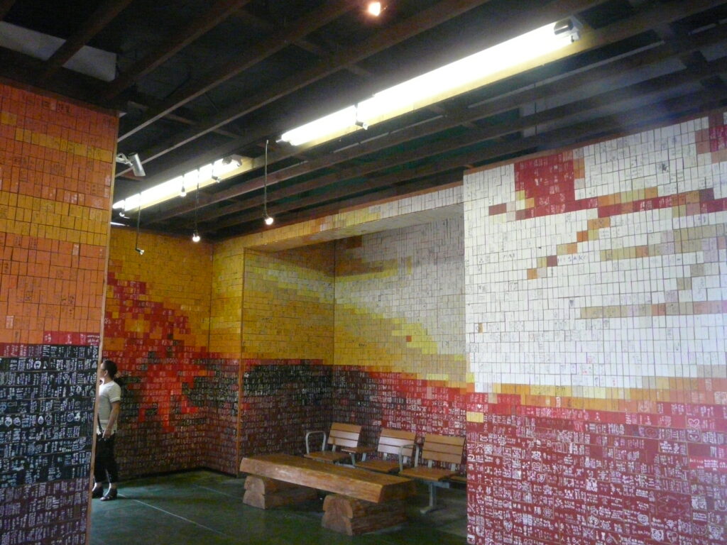 仙崎は詩人「金子みすゞ」のふるさとで知られており、駅舎の中は木札で造られたモザイクアートで囲まれていました。駅事務室側もギャラリーとして使用されており、駅自体も観光施設として楽しむことができます。