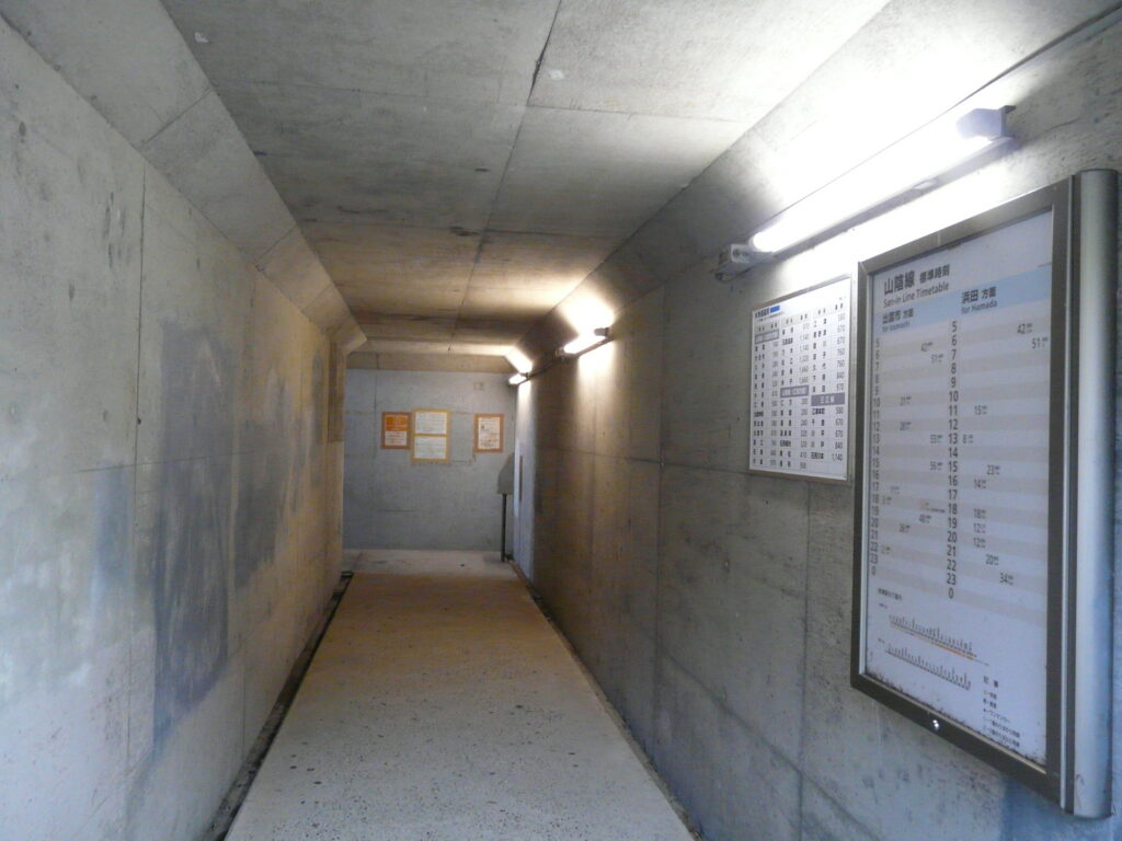 ホームから出口に移動します。この駅は地下道で移動する形になっており、駅の地下はコンクリートに囲われた通路、そこに時刻表や運賃表が設置されています。