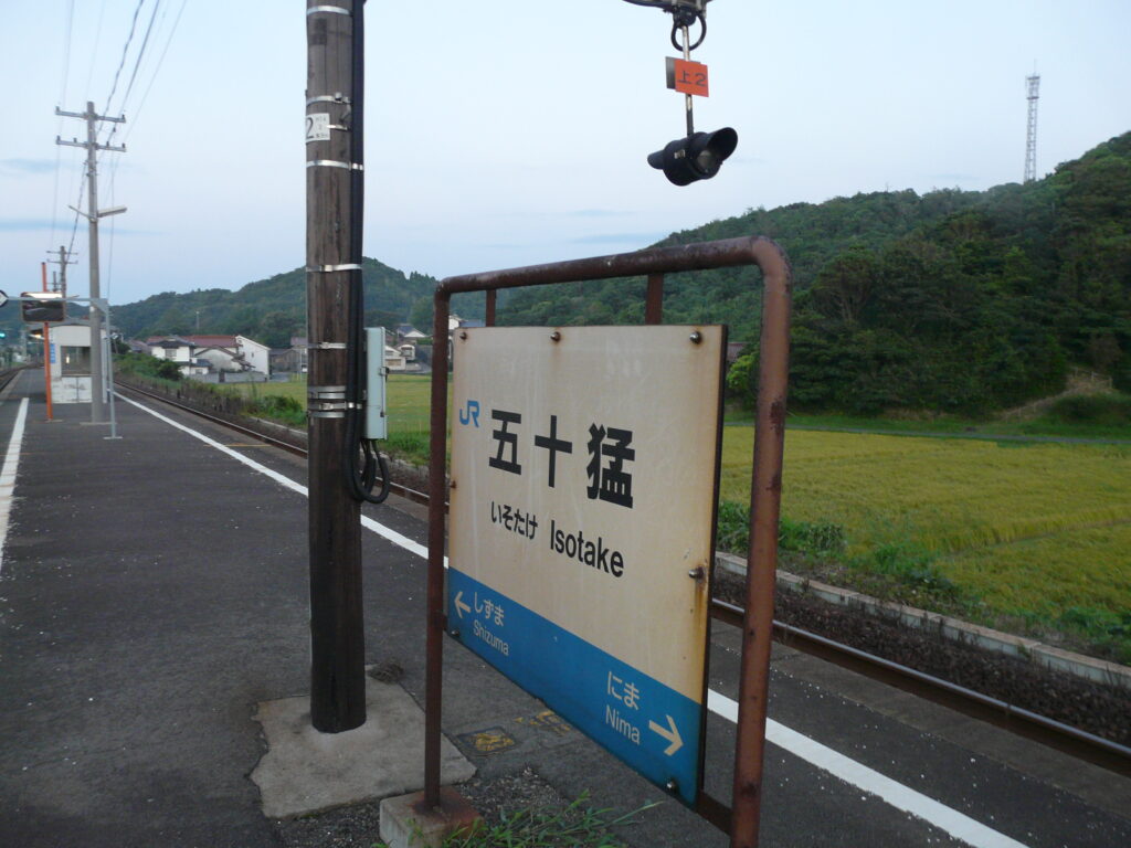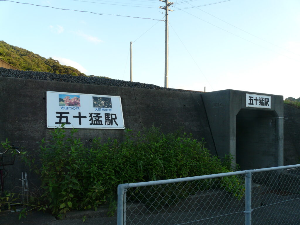 この駅は「五十猛駅」、山陰本線の途中駅です。ホームは1面2線の交換可能な構造、ホームから畑や集落が見えるのどかな駅です。
