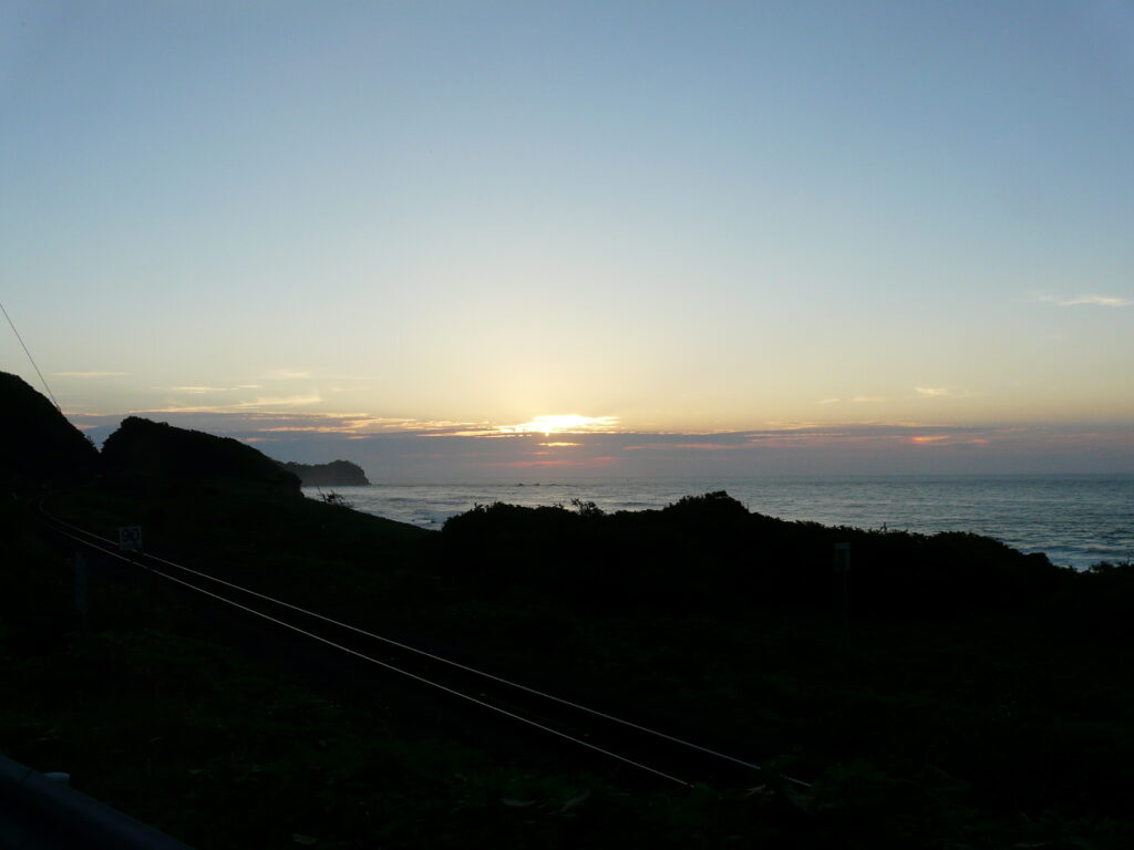 駅から西へ、国道9号から一本入ったところからきれいに海に沈む夕日と線路が望める場所がありました。もっといいカメラがあればいい写真が撮れるんでしょうかね?