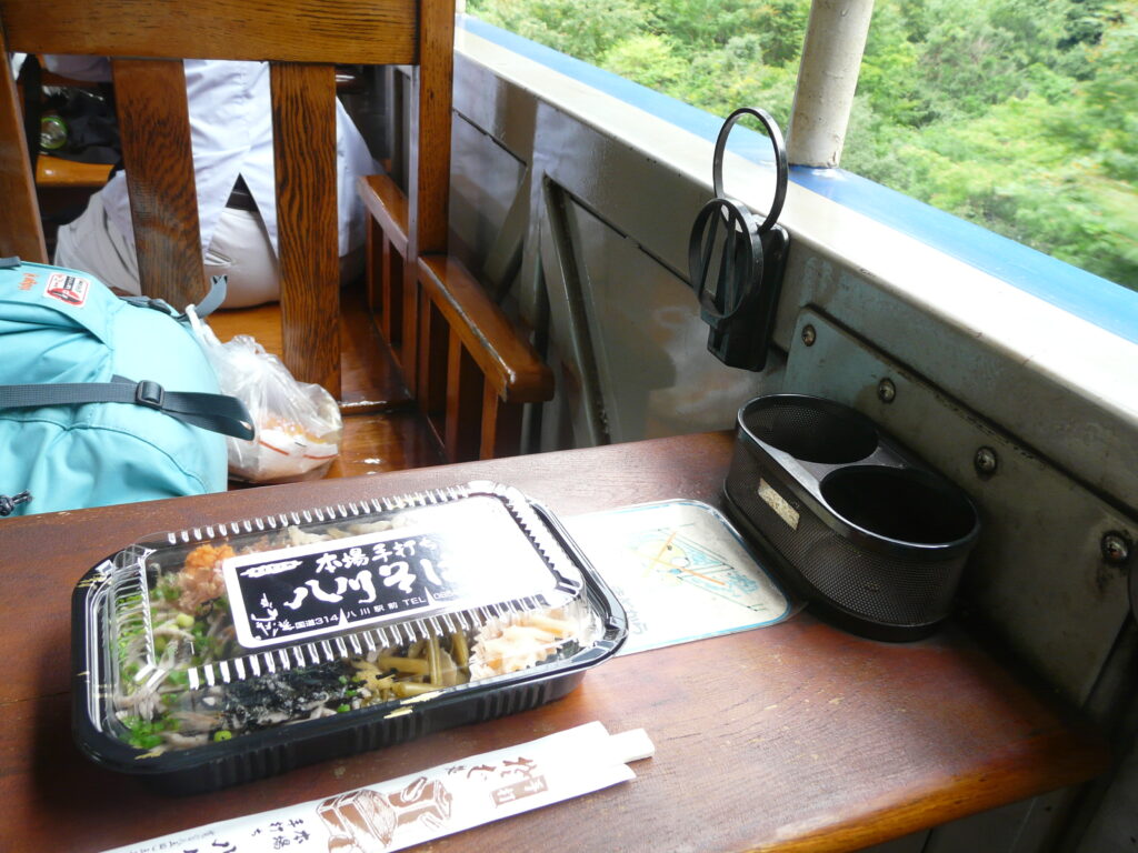 折り返し列車にも乗車します。一定数備後落合から芸備線に乗り換える人もいるため、比較的ゆったりすることができました。ここで駅弁の「八川そば」をいただきます。