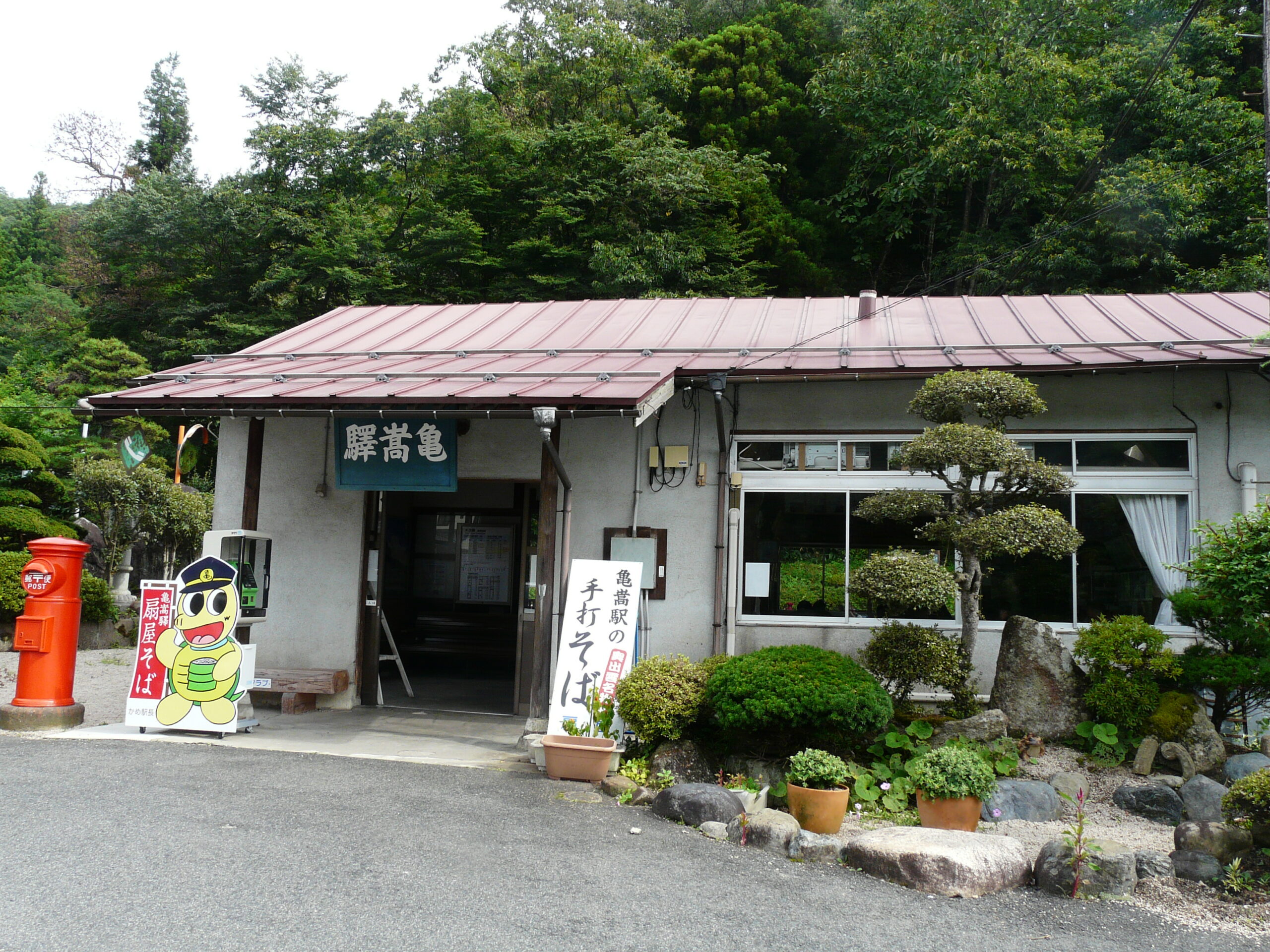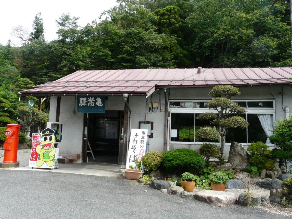 亀嵩駅の駅舎。右から読むタイプの旧字体の「驛嵩亀」の駅名標がいい感じ。