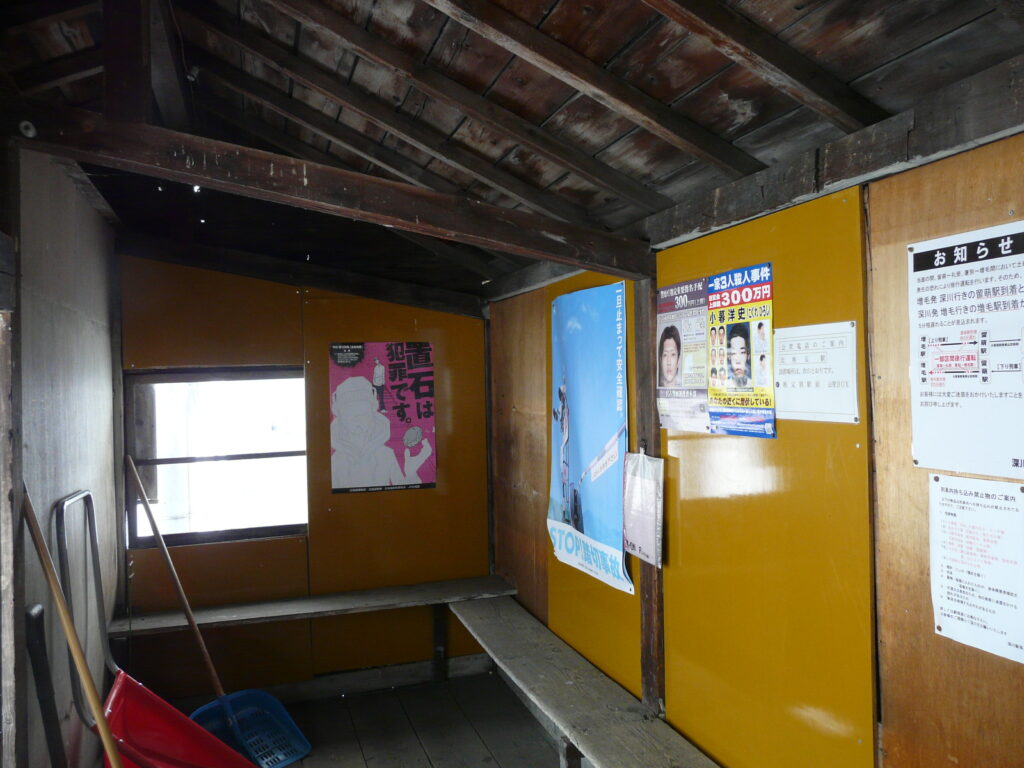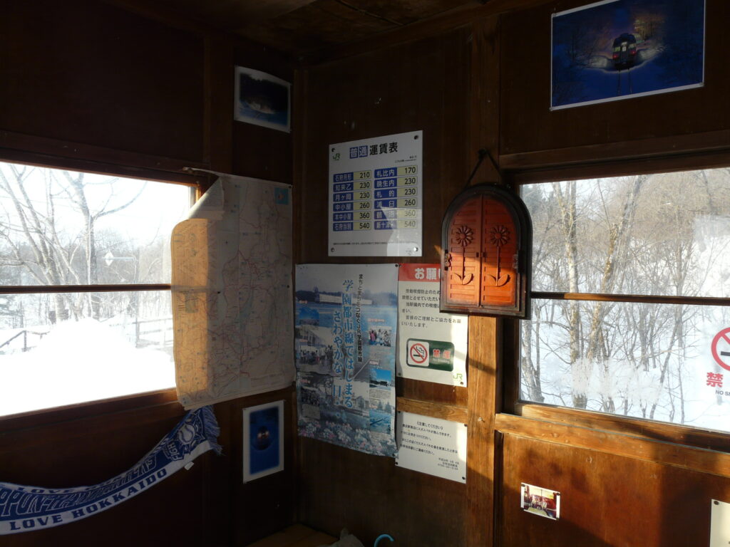 中は時刻表、運賃表、以外にも周辺地図や札沼線や豊ヶ岡駅の写真など様々なものがが飾ってあります。秘境駅によくある駅ノートもここにありました。