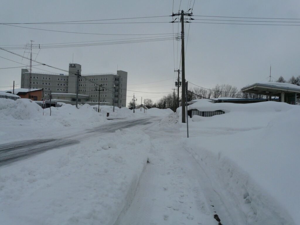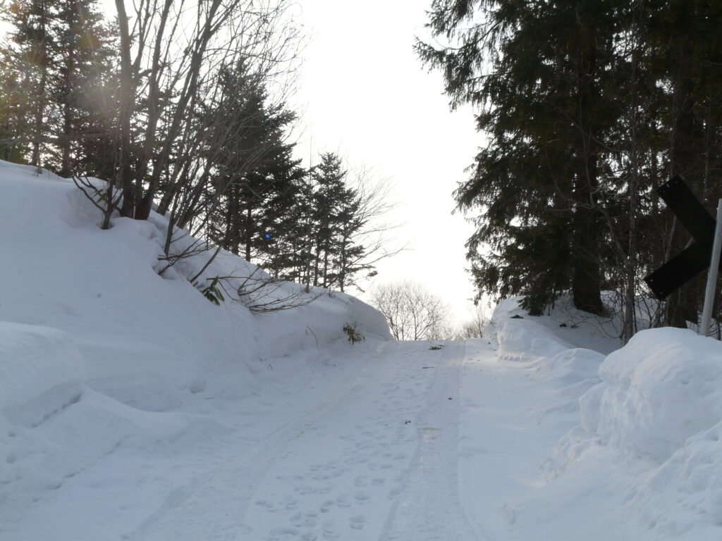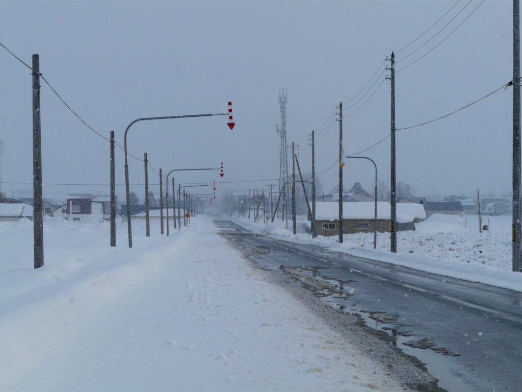 道中はいかにも北海道らしい、まっすぐの道に道路の端を示す「矢羽根」が設置されています。地味に雪が降る中、温泉へ向かうためひたすら歩きます。