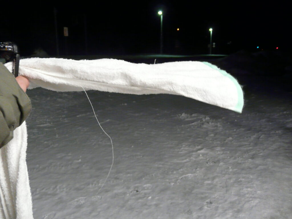 ここであれば自分が不審者であっても見られることはありません。振り回して10秒程度ですぐ凍りました。とても寒いです、、、。