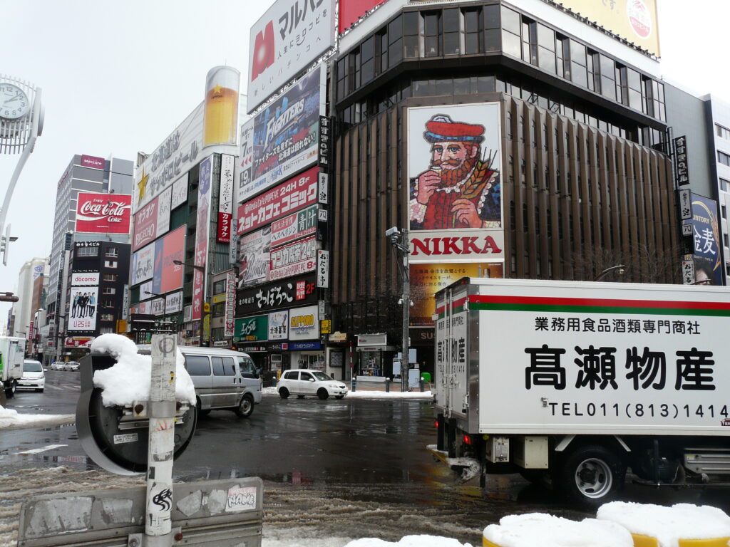 まずは有名な「すすきの」交差点、NIKKAの看板が特徴的です。昼下がりに訪問しているためイメージは違いますが、夜には「眠らない街」に変わります。