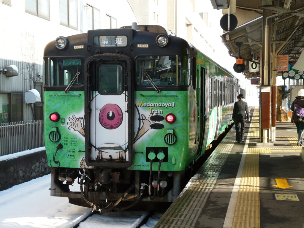 米子駅には0番線があり、非常に特徴的な列車が走っています。これは境港線。終点の境港駅はゲゲゲの鬼太郎の作者水木しげるのふるさとであるため、妖怪での町おこしが盛んです。