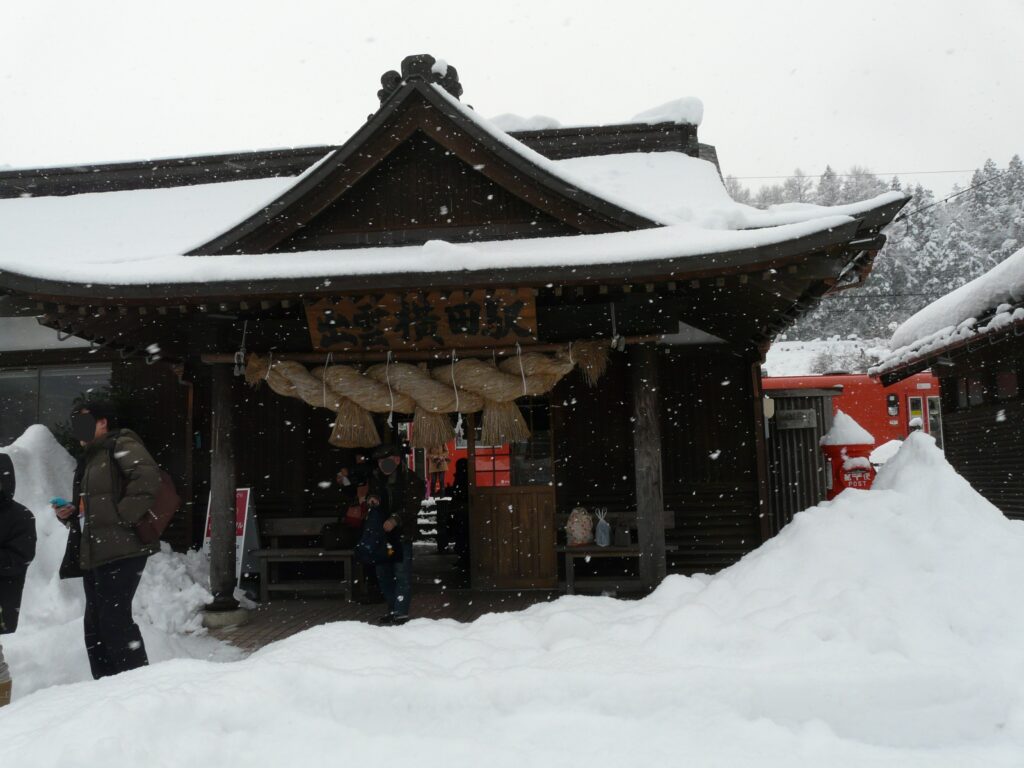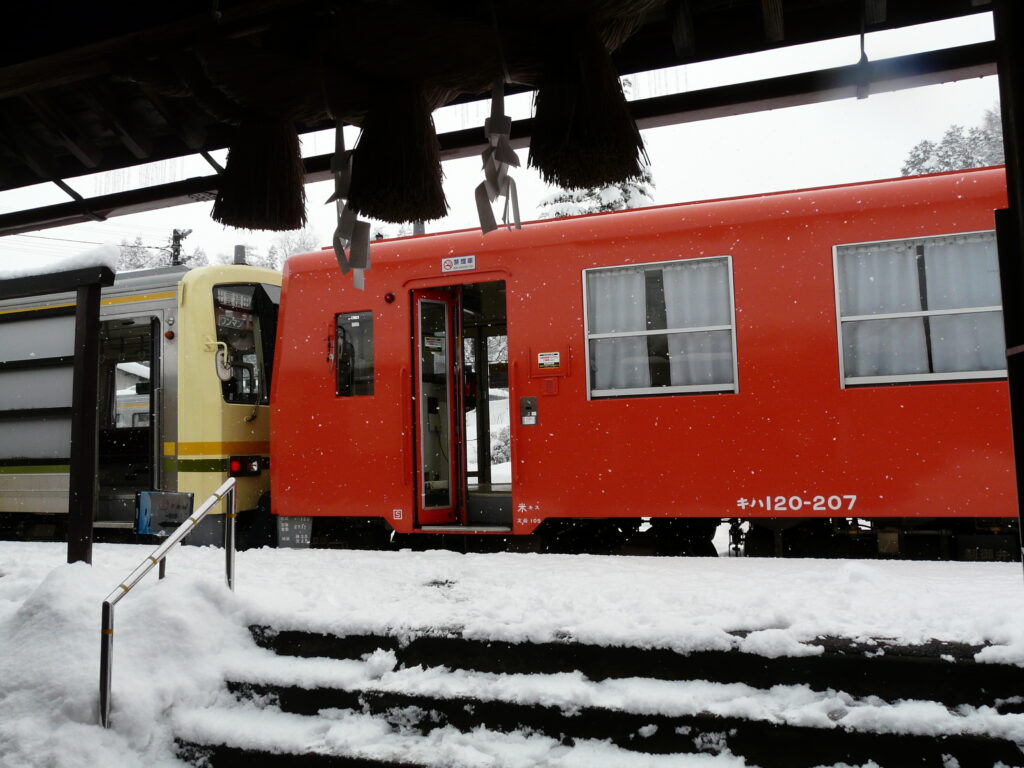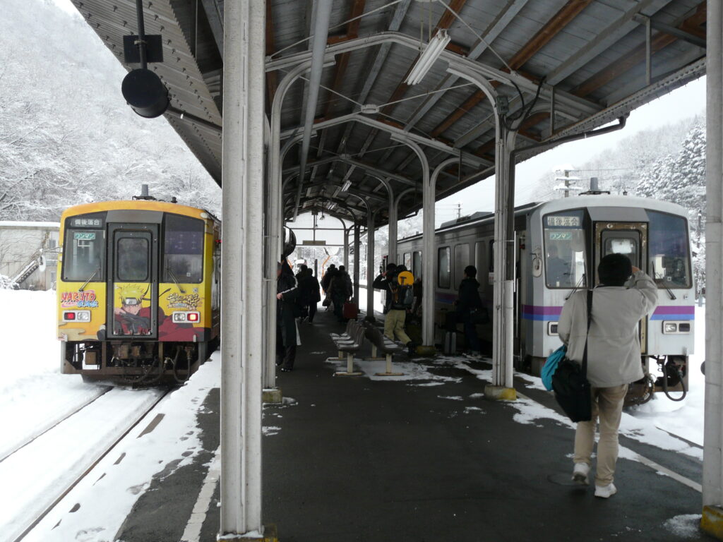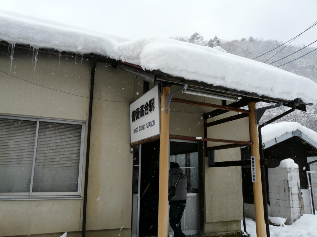 だいぶ山間に分け入ってきました。出雲横田駅よりも屋根の雪の厚さも一層分厚くなったような気がします。三方向の分岐点の駅と聞くと人里の中にある割と栄えた駅というイメージがありましたが、周囲には家がわずかにあるのみのまさに山の中です。