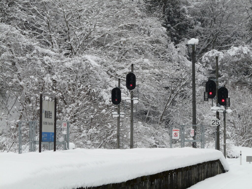 まさに山間の秘境駅という雰囲気のなかに信号機が4つあり、交通の交通の要衝でもあることがわかります。