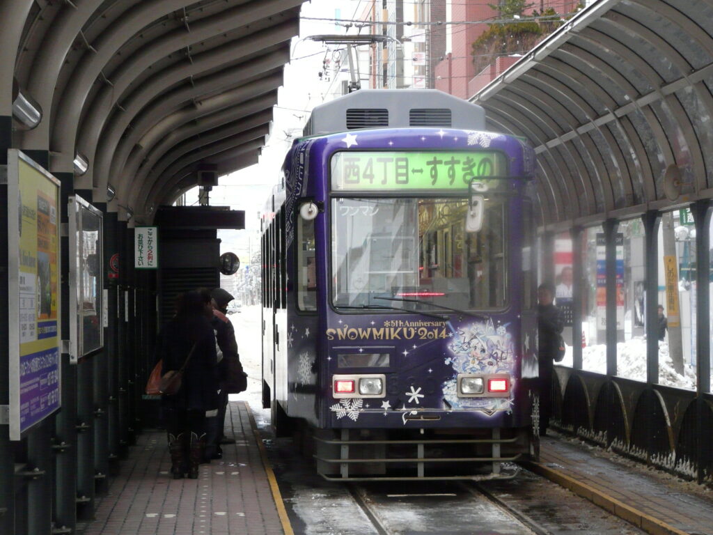 さて、この旅行最終日!今日は基本的に寄り道をせずに帰ります、と言いつつ一番最初に来たのはここ札幌市電の電停です。実はもう一つの目的はこの路面電車”雪ミク電車”に乗りに来たのでした。作者の趣味がばれてしまいます。