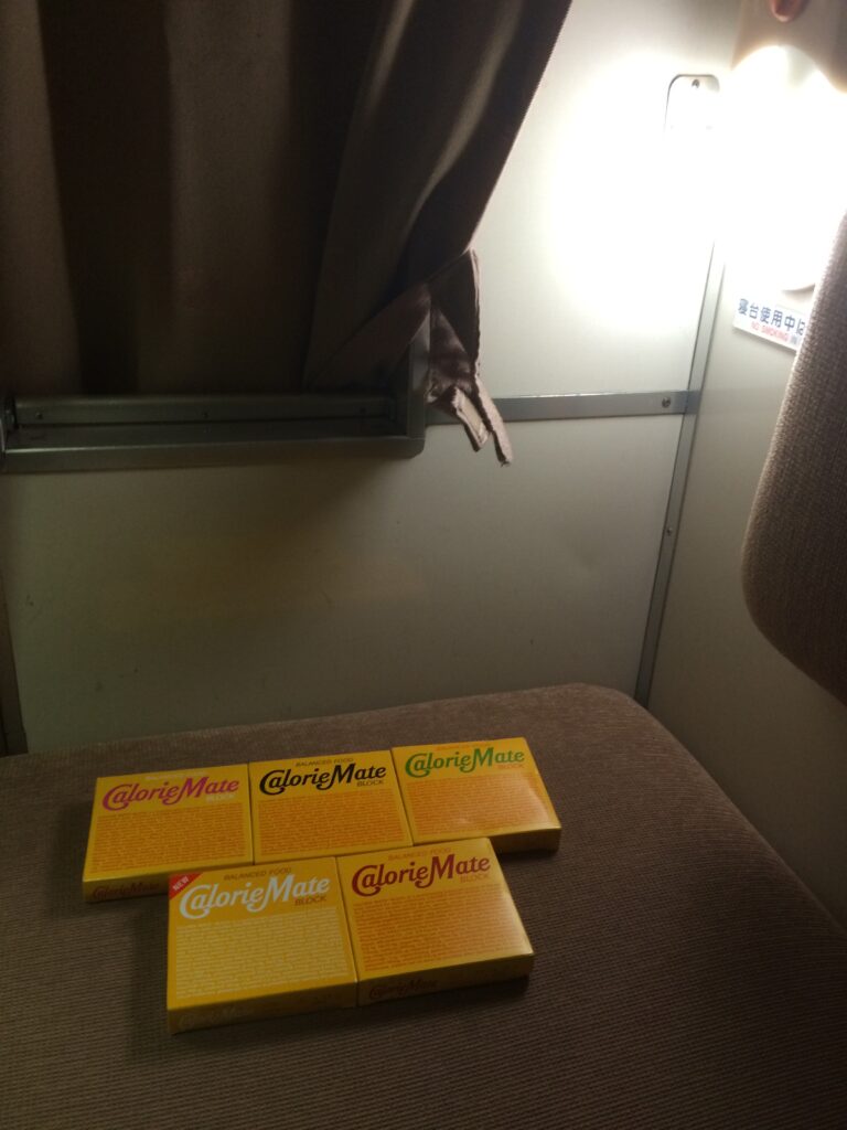 仕切りのカーテンを閉めても中には読書灯のような灯りがあり、プライベートな空間が確保できます。そのプライベート空間で今夜のご飯であるカロリーメイトのフルコースをいただきます。