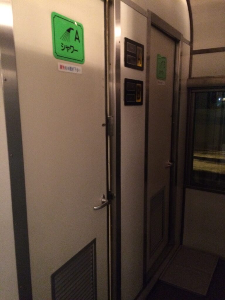 シャワー室は6号車にA,Bの2つありました。現在のサンライズも同様ですが、シャワー室は30分利用できますが、お湯を使えるのは6分間です。