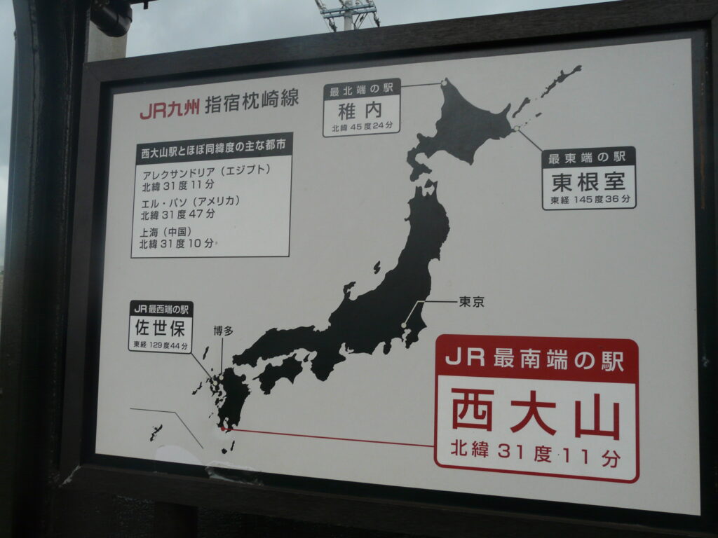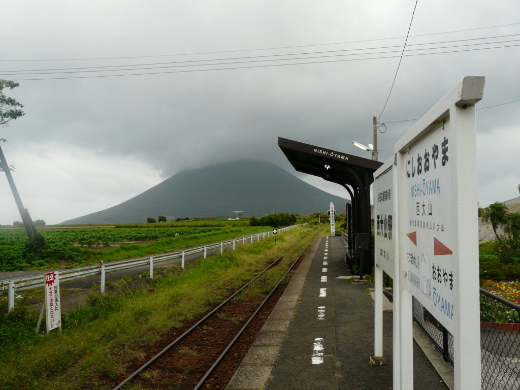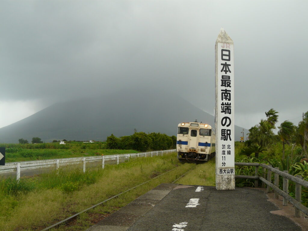 駅は小さなプラットホームの無人駅ですが、ホームには最南端を示す看板や碑があり、駅の西側には日本百名山の開聞岳が望めます。